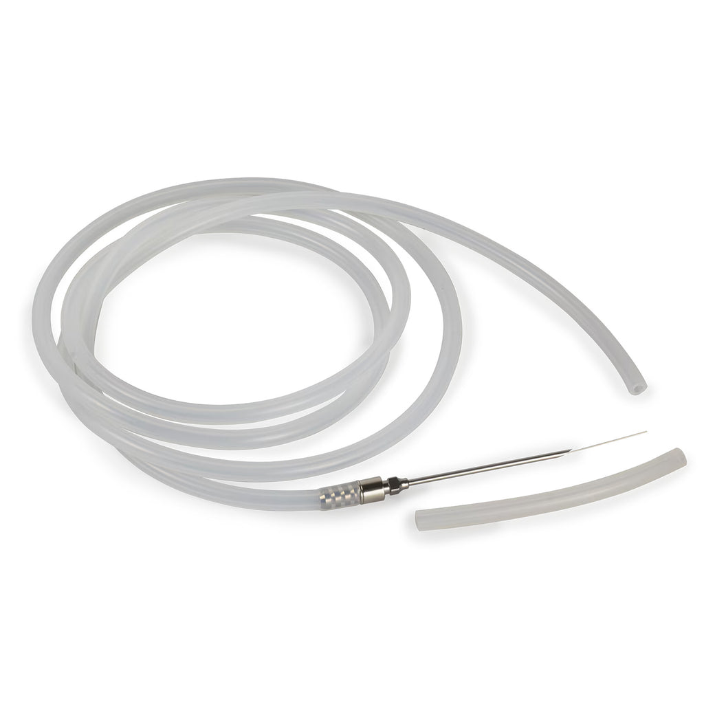 Dirksen-malli. Kanyyli 2,7 mm x 80 mm. Sopivalla adapterilla (Luer-Lock) sekä 2 m silikoniletkulla. Autoklavointia kestävä.