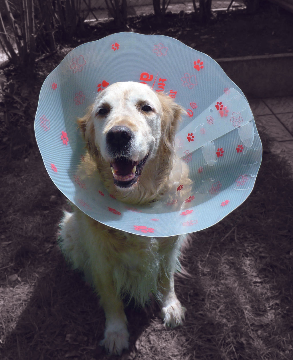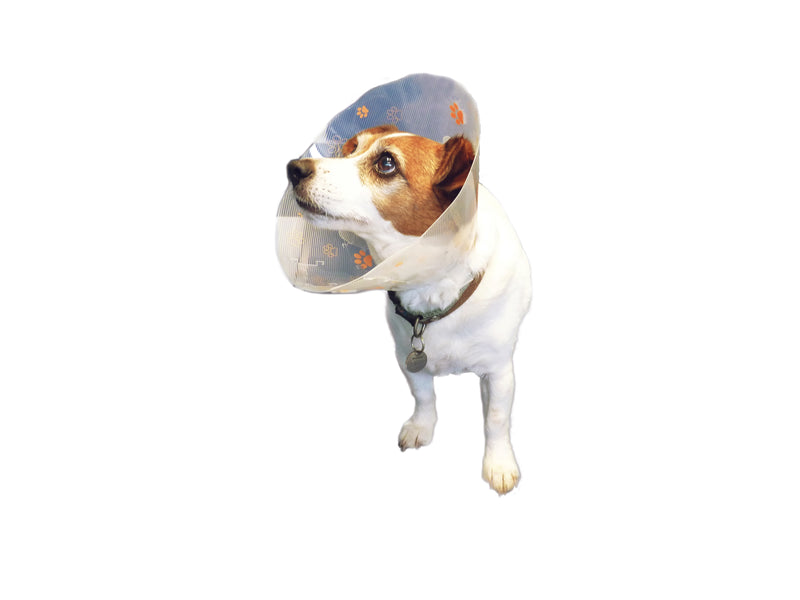 Läpinäkyvä kaulakaulus, jossa värillinen tassuprintti. Helppo kiinnitysmekanismi.